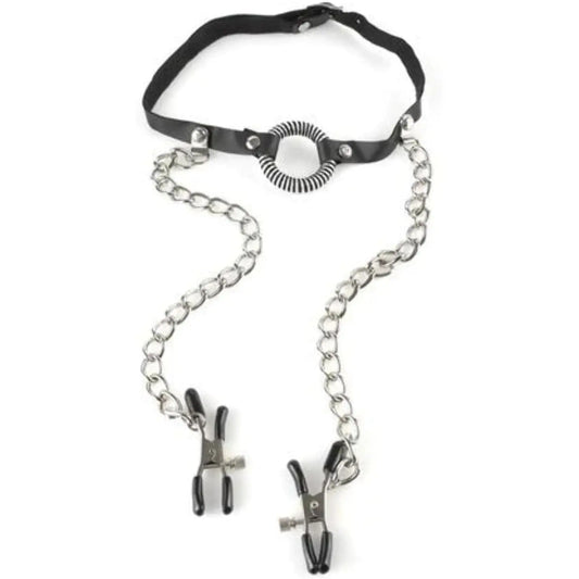 Adjustable O-Ring Gag - Open Mouth Gag With Attached Nipple Clamps